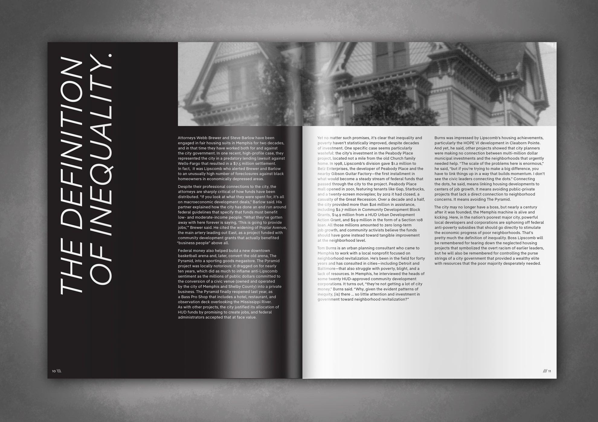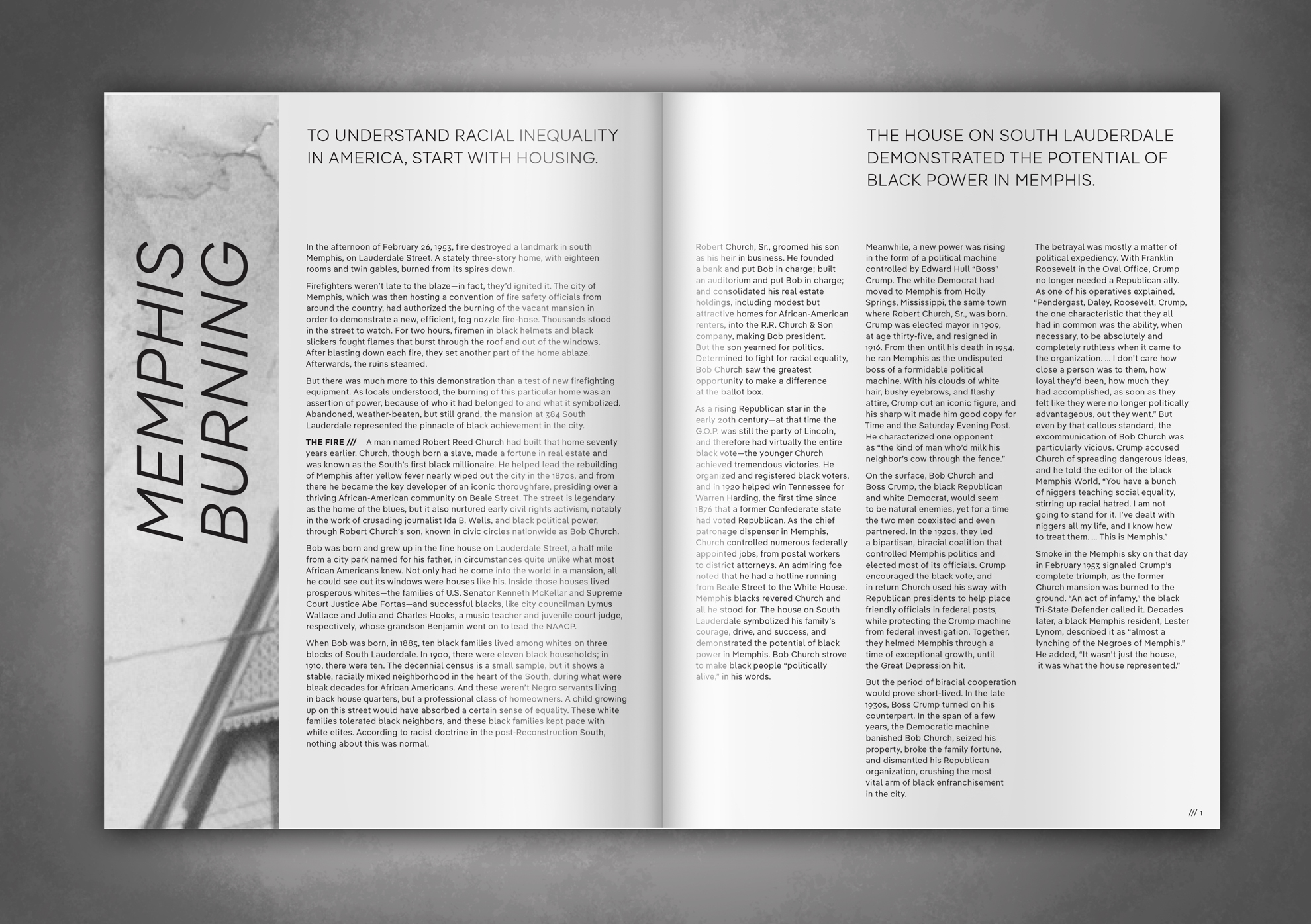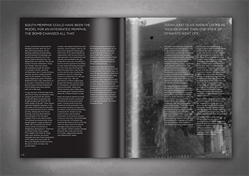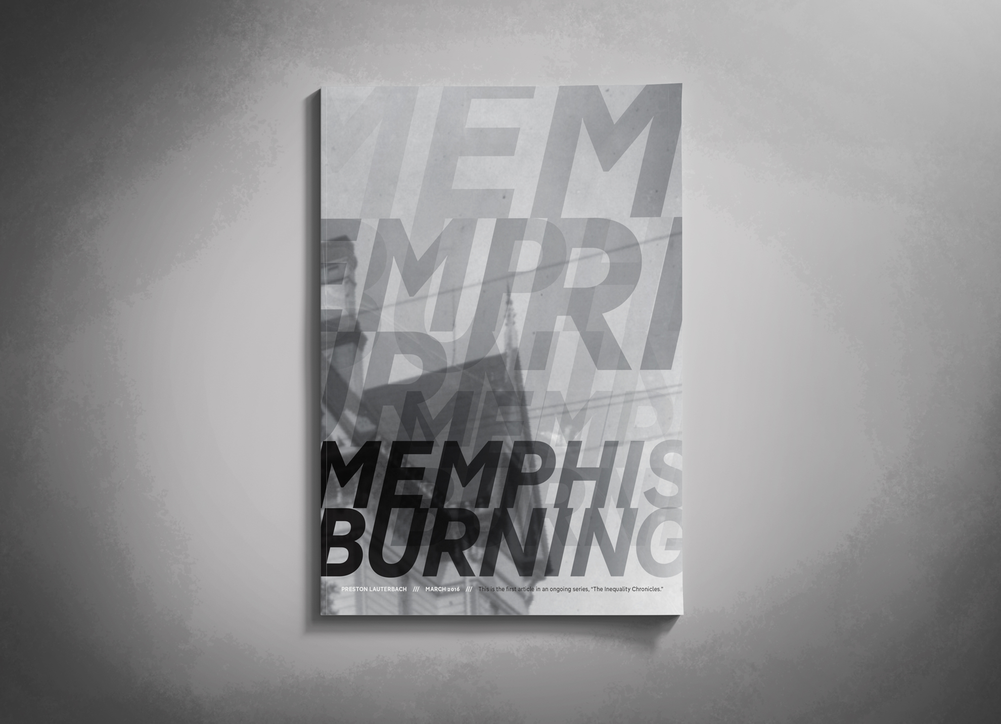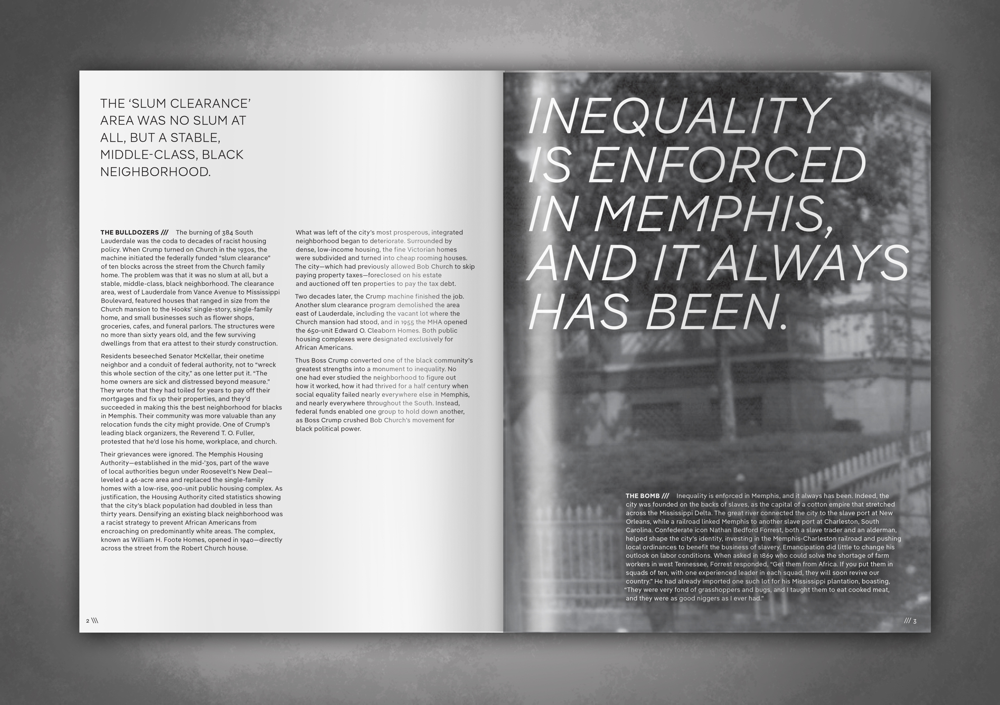 This following booklet layout was created using one photo. For the cover, scale and transparency in type were used to invoke smoke over abstracted crops of the photo from the article. A black and white palette reinforced the sober subject of a black community in Memphis and its struggle within racist America.