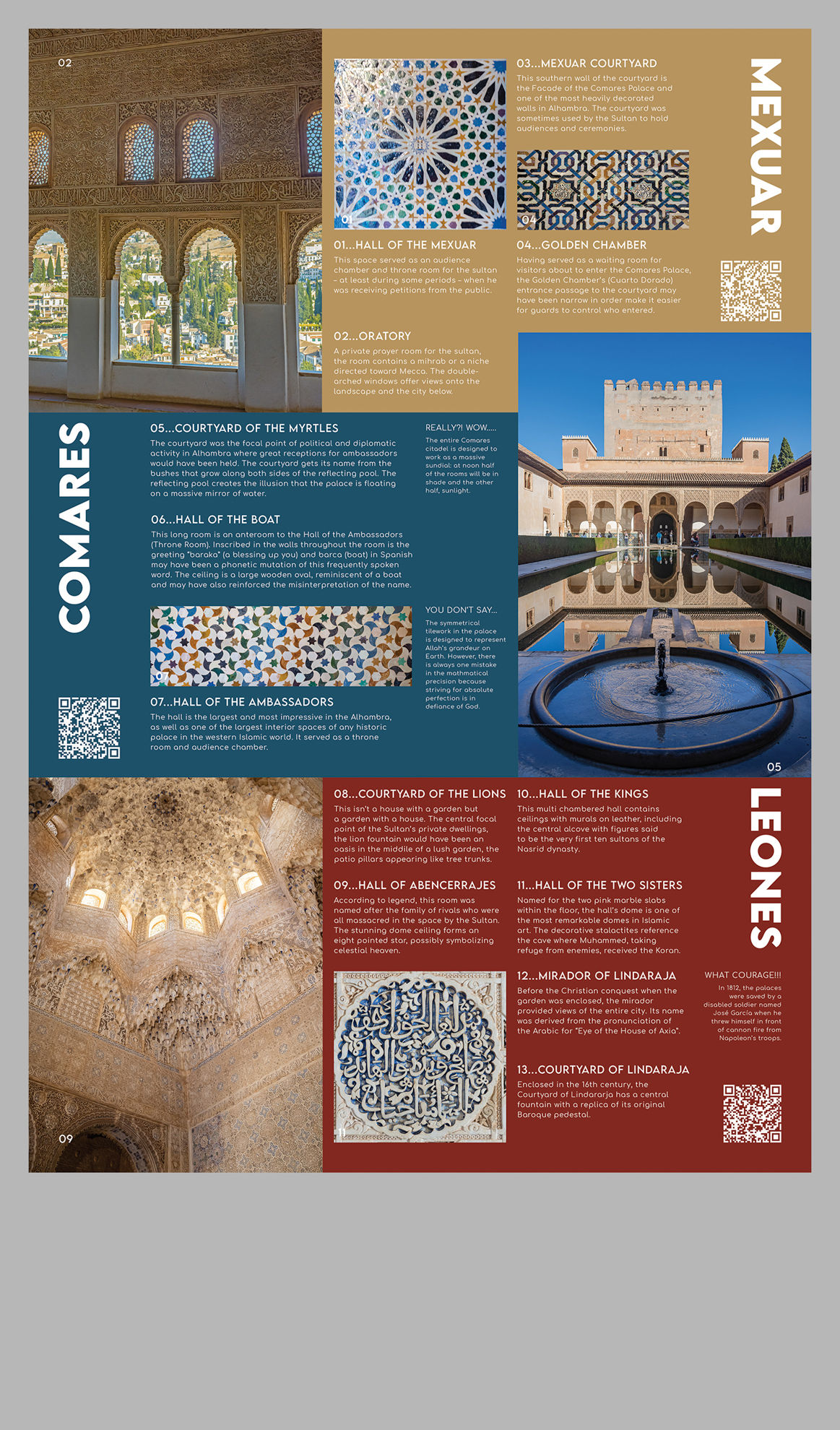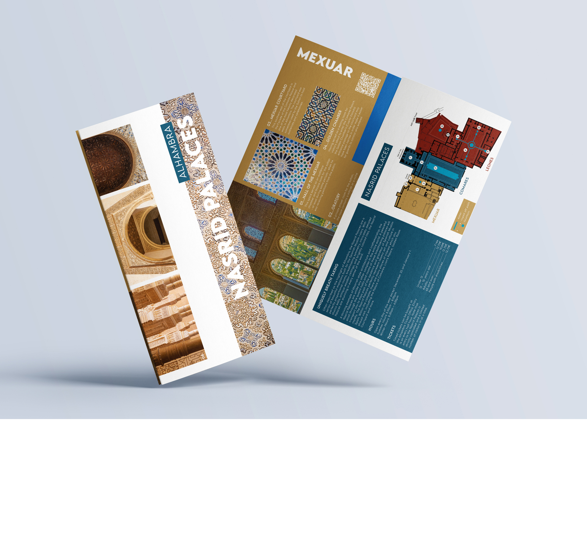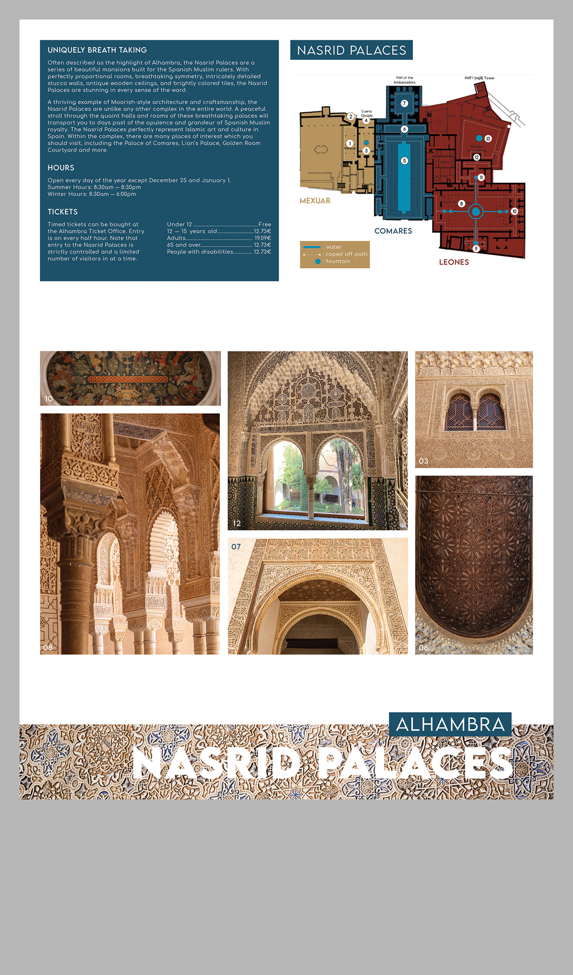 As way finding for the Nasrid Palaces of Alhambra in Grenada, Spain, this Unigrid based brochure includes a map as well as information and features of the palace.
